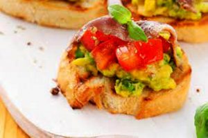 Pour la recette des crostinis à l’avocat, tomates et anchois les ingrédients sont : baguette, avocats, anchois, tomates, citron, gousse d’ail, botte de basilic, huile d’olive, sel, poivre