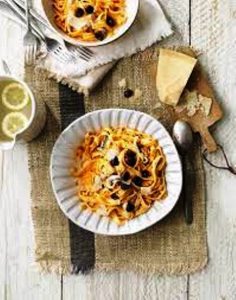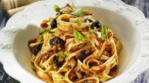 Pour la recette des pâtes à la sicilienne les ingrédients sont : tagliatelles fraîches, coulis de tomates au basilic, anchois, olives noires au sel rincées et dénoyautées, gousses d’ail, huile d’olive, Parmesan, fleurs de câpres…