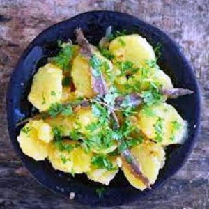 Pour la recette de la salade de pommes de terre aux anchois les ingrédients sont : filets d’anchois marinés à l’huile, oeufs, belles pommes de terre à chair jaune, olives noires, échalotes, gousses d’ail, persil, vin blanc sec, vinaigre, huile, sel, poivre…