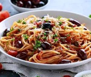 Pour la recette de la spaghettis alla puttanesca les ingrédients sont : côte de blette sans le vert, tomate mûre, gousse d’ail, câpre au sel, olive noire dénoyautée, filet d’anchois au sel, peperoncino, brins origan, huile d’olive, sel et poivre du moulin…