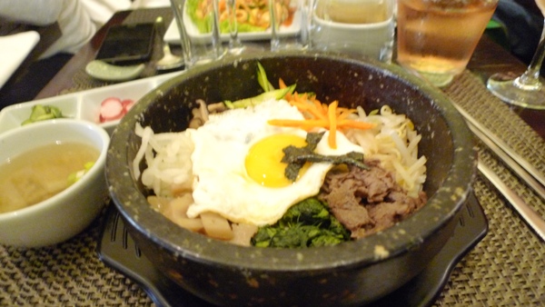Mon plat principal c’est : DOLSUT BIBIMBAP, riz nappé avec des légumes (choux chinois, bambou, nouilles…) et œuf au plat servi dans une marmite chaude, en effet lorsque cela arrive c’est bouillant, les plats sont accompagnés de divers condiments et d’un bol de soupe, c’est très gouteux.