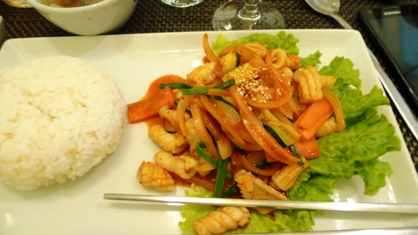 Ensuite,pour mon compagnon de tablée, il a choisi : OJINGEO DEOBBOP: sauté d’encornets au piment et riz, il est ravi.