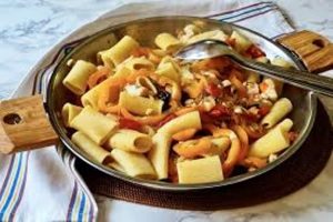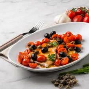 Les divers ingrédients utilisés pour réussir la recette sont : paccherotti, oignon, poivrons oranges, tomates cerise, merlan, câpres, olives noires, huile d’olive…