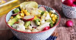 Les divers ingrédients utilisés pour réussir la recette sont : avocats, maïs, radis, filets de merlan, huile parfumé au curry, citron…