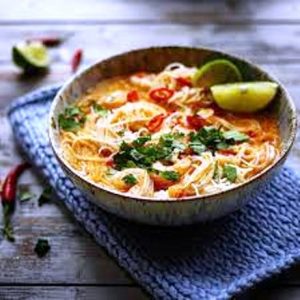 Les ingrédients utilisés pour cette recette de laksa sont: filet de poulet bio, nouilles de riz, tofu ferme, huile de sésame, pâte de curry rouge, bouillon de volaille, crème de coco bio, citron vert bio, branches de menthe fraîche…