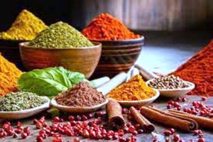 Aides culinaires et épices : poivre noir, moulu, gousses de cardamome, vertes, clous de girofle entiers, garam masala, sel casher, poudre de piment rouge, curcuma, en poudre, huile neutre…