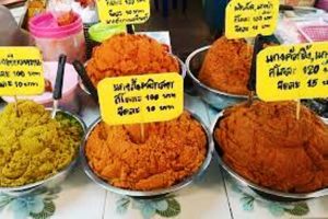 La pâte d’épices : échalotes hachées, piments séchés, trempés dans l’eau chaude, piments rouges, hachés, gousses d’ail hachées, gingembre haché, galanga haché, noix de curcuma haché, noix du Brésil, hachées, citronnelle hachée (partie blanche seulement), morceau de pâte de crevettes, grillé, pâte de curry de viande malaisienne…