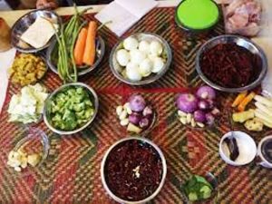 Les ingrédients utilisés pour cette recette du tarkari sont: huile, garam masala, curry, sel, poivre, oignons, gousse d’ail, lentilles, eau, pommes de terre, riz, sauce soja, sak (épinards ou oseille), gingembre frais râpé, petits pois, tomates, yahourt, achard, papads (crêpes croquantes ou chapatis )…
