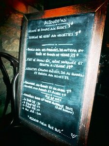 Nous nous installons à la table et le serveur nous présente l’ardoise du menu : 17 €: entrée, plat ou plat, dessert.