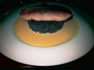 Pour le plat nous sommes sur la même longueur d’ondes, c’est un saumon rôti sur un lit de riz à l’encre, le saumon est bien rôti, le riz est bien préparé, bonnes saveurs marines.