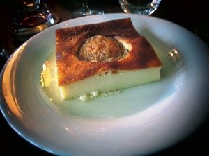 En dessert mon amie a choisi une flognarde aux pommes, à la dégustation elle remarque que le gâteau repose sur un lit de calvados, elle me déclare que c’est un vrai délice entre les pommes compotées, la texture de la flognarde et l’alcool un très bon.