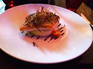 Pour suivre, j’ai choisi: le filet de bar sauvage, purée à l’huile d’olive de Charles Aznavour 32 €, un beau plat, une délicieuse senteur se dégage, le poisson est cuit parfaitement, la purée est assez aérienne, l’huile d’olive de Charles Aznavour est un complément judicieux, je me régale.