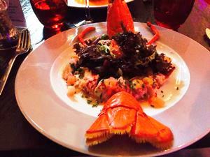 Pour commencer nous avons commandé une salade de homard tiède, vinaigrette au jus de truffe 27 €, voilà une superbe salade, le homard est cuit comme il se doit , je savoure ce mets délicatement assaisonné, le goût de la truffe s’accorde à merveille, chaque composant du mets garde sa saveur sublimé par son compagnon.