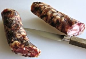 Généralement vendue à cuire, certains la préfèrent sèche, en raison de la saveur particulière communiquée par les abats salés.