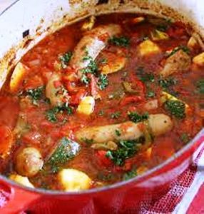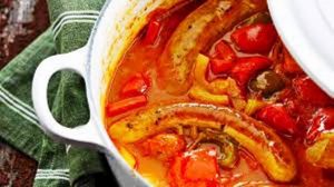 Les ingrédients de cette recette sont : saucisses, poivron rouge, poivron vert, poivron jaune, passata de tomates (coulis), farine, branches de céleri, oignon, gousses d’ail, vinaigre de vin rouge, bouillon, huile d’olive, brins de thym, brins d’origan, paprika, sel, poivre du moulin…