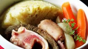Les ingrédients de cette recette sont : viandes de bœuf, morceaux à bouillir comme le plat de côte, le jarret avec os à moelle, le paleron ou la macreuse, le confit de canard ou d’oie et de la charcuterie : saucisson à cuire et petit salé.
