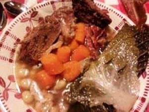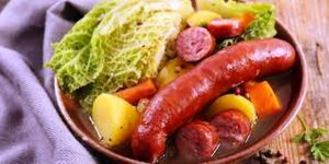 Les ingrédients de cette recette sont : viande de votre choix, dont du jarret de porc, poireaux, carottes, navets, chou vert, oignon, bouquet garni, sel, poivre…