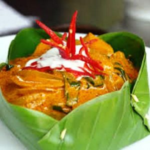 Ingrédients : poisson blanc (cabillaud, tilapia, …), pâte de curry kroeung, pâte de curry rouge, sauce de poisson, sucre de palme, pâte de crevette, sel, œufs, lait de coco, feuilles de bananier, poivron rouge…