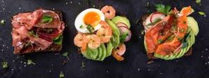 Ingrédients : tranches de pain de seigle, crevettes, filets de harengs marinés, grande tranche de saumon fumé, avocat, concombre, oignon rouge, mayonnaise, coriandre ou aneth…