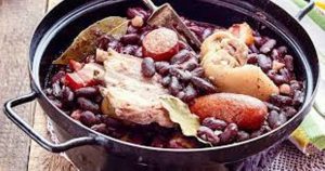 Feijoada : haricots noirs, saucisses fumées, travers de porc salés, poitrine de porc fumée, viande de palette de porc, oignons jaunes, gousses d’ail, bouquet garni, feuilles de laurier, poivre, sel, huile d’olive…