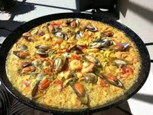 Ingrédients : riz longs grains, cuisses de poulet, langoustines, belles gambas, moules de bouchot, moules d’Espagne, encornets, poivrons rouges, poivron vert, crevettes, belles tomates, gousses d’ail, petit piment, petits pois écossés, bouquet garni, huile d’olive, safran, spigol (pour colorer le riz), bouillon de poulet, clou de girofle, citrons, oignons, sofrito, sel, poivre…