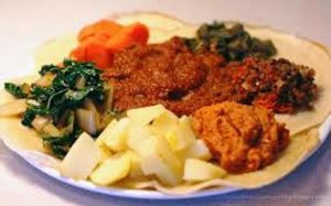 Ce plat typiquement érythréen est composé de différentes préparations: fricassé de poulet ou de boeuf piquant, salade, légumes cuits, le tout est servi sur des enjeras, des sortes de crêpes acidulées qui servent de pain mais aussi de couverts.