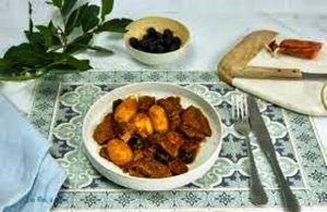 Les ingrédients utilisés pour réaliser la recette sont :   sauté de veau, petites pommes de terre, chouriço doux, olives noires dénoyautées, concentré de tomates, porto rouge, eau, oignon, gousse d’ail, feuille de laurier, sucre, huile d’olive, sel, poivre…