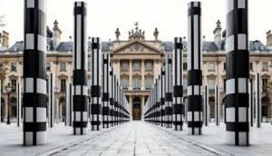 Installation contemporaine composée de colonnes rayées noires et blanches, par Daniel Buren.