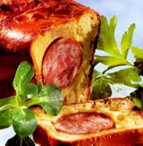 Les ingrédients utlisés pour réaliser la recette sont : cervelas pistaché, beurre mou, œufs entiers + jaunes, farine, sucre, levure fraîche du boulanger, lait tiède, sel…
