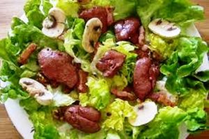 Comme avec la salade du Périgord, elle mélange chaud et froid dans une même assiette, avec des gésiers confits et du magret de canard. On peut y ajouter du persil, des croûtons de pain, ou des morceaux de foie gras pour les plus gourmets.