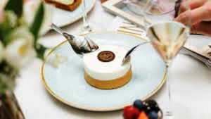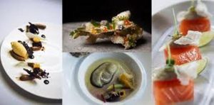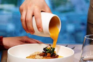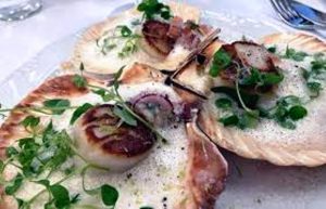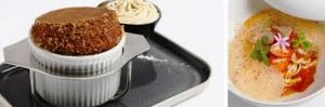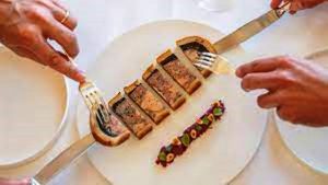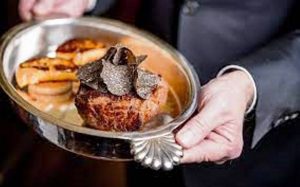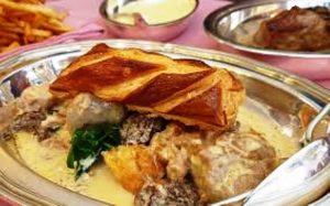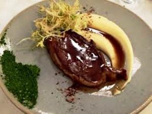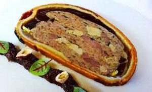 Pâté en croûte de gibier et foie gras de canard, chutney de figues aux épices – Quenelles de brochet à la lyonnaise, sauce Newburg, riz Basmati grillé – Profiterole de glace vanille et sauce chocolat noir cœur de Guanaja servie à la chocolatière.