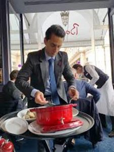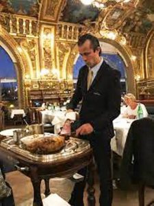 Mais ici, le spectacle est aussi dans la salle, quand la voiture de tranche arrive à bon port devant votre table pour couper le gigot d’agneau, et que le Groom qui vient de faire son retour vous aide à monter votre valise ou vous annonce votre train ! Menu voyageur servi en 45 minutes.
