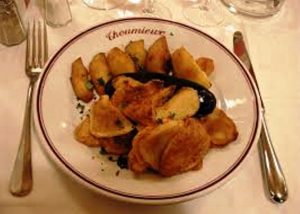 On opte ensuite pour un plat culte de Benoit Paris, la tête de veau tigre bio en ravigote (34€), une vraie merveille ; avant d’enchainer avec un plat rempli de reliefs et diablement sapide, le sauté gourmand de ris de veau, crêtes et rognons de coq, foie gras, jus truffé (48€), que l’on sauce jusqu’à la dernière goutte et que l’on ne saurait que trop vous recommander si vous êtes amateurs d’abats.