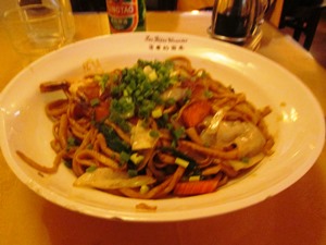 Pour suivre, j’ai choisi des nouilles sautées aux légumes et aux crevettes, au bout d’un certain temps le serveur dépose le plat,  c’est très odorant, bien chaud, bien garni, les nouilles sont fermes et fondantes, les divers légumes et crevettes sont assaisonnées avec talent, un régal, les épices sont utilisées avec justesse.