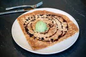 Mi- bretonne mi- nipponne, on craque pour cette crêpe au beurre Bordier, revisitée à la poudre de soja kinako et au sucre noir d’Okinawa. L’objet des délices est servi accompagné d’une glace matcha. A mouiller au cidre artisanal de petit producteur !