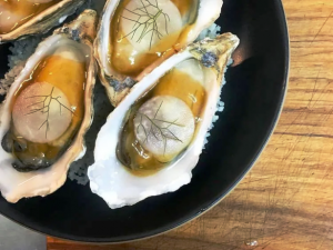 De grosses huîtres creuses (numéro 0), en gelée, associées à du maquereau de Saint-Gilles-Croix-de-Vie, raifort, radis noir et capucine. Un rail d’iode subtil, terre/mer maîtrisé d’Antonin Bonnet, super-toque au CV en or (feu Le Sergent Recruteur à Paris, The Green house à Londres, Michel Bras à Laguiole…)