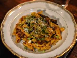 Servi en deux services : d’abord ces fettucine au ragoût de cœur et de foie, pleurotes et olives à nous faire chialer de bonheur ; puis, tout aussi gourmand, la carcasse à tortorer avec des petits pois, cerises et salade au jus de cuisson. Une jolie claque et un plaisir à faire au moins une fois dans sa vie.