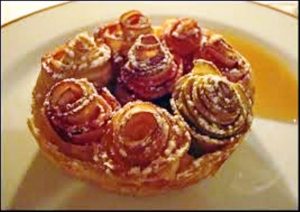 Encore trop souvent maltraitée par des kilos de gélatine chez la plupart des pâtissiers, cette tarte en forme de bouquets de roses, grand classique d’Alain Passard, est livrée dans son plus simple appareil : une ultra fine pâte feuilletée sur laquelle sont déposées de délicates lamelles de pommes en corolle. Bon à savoir : vous pouvez aussi la commander à emporter !