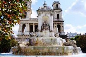 Plus dépouillée que la plupart de ses consœurs, la fontaine Saint-Sulpice est remarquable par sa hauteur de douze mètres et sa situation exceptionnelle, aux pieds de la splendide église du même nom. Conçue à la fin du XIXème siècle par l’architecte Louis Visconti, elle se compose de trois bassins superposés ornés de lions et de vasques, et d’une haute tour carrée. Nichés dans les faces de cette dernière, quatre évêques de l’époque de Louis XIV, sont représentés assis en direction de l’est, de l’ouest, du nord et du sud, ce qui vaut à l’édifice le surnom de « Fontaine des quatre points cardinaux ».