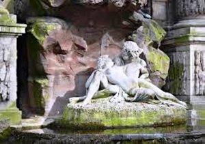La fontaine Médicis, prisée pour son charme par les photographes du monde entier, attire sur ses rives étudiants, flâneurs et amoureux tout au long de l’année. Le couple de marbre tendrement enlacé de son motif central prête aux doux sentiments. L’ombre bienfaisante de sa double allée de platanes lui confère une quiétude heureuse. Classée par liste de 1889 aux Monuments historiques, la fontaine Médicis a tout d’abord été la grotte du Luxembourg, une construction artificielle inspirée par la grotte de Buontalenti du Palais Pitti, où la reine-mère Marie de Médicis (1575-1642) a vu le jour. Au lendemain de la mort d’Henri IV, sa veuve, la régente de France jusqu’en 1614, souhaite faire construire une résidence à Saint-Germain-des-Prés dans le style florentin, en souvenir de sa ville natale. En 1611, elle fait l’acquisition de l’hôtel particulier de François de Piney, duc de Luxembourg. Pour donner de plus royales proportions au domaine, elle achète des terrains aux alentours.