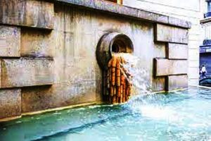 L’eau s’écoule depuis le sommet de trois colonnes doriques cannelées enchâssées, de diamètres croissants et ruisselle dans un bassin pour rejaillir par une bouche ornée dans un second bassin et déborde jusque dans un troisième.