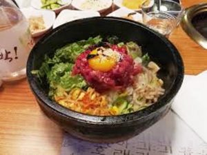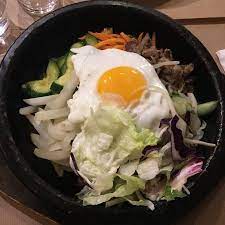 Le bibimpap kézako ? À gouter du riz, de la viande marinée, des petits légumes, des condiments, un œuf et une sauce plus ou moins épicée selon les goûts ; le tout servi dans une marmite de fonte chauffée.