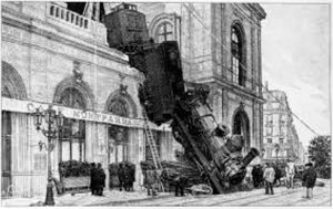 Un accident, le 22 octobre 1895, fait traverser la façade par une locomotive à vapeur d’un train Granville-Paris, dont le freinage à main (freins à air comprimé de la société Westinghouse) était défectueux. La photo prise après l’accident montre que la machine est presque à la verticale, l’avant s’étant écrasé au milieu des débris, son tender s’appuyant contre le bâtiment, et l’on distingue, au premier étage de celui-ci et à plusieurs mètres de hauteur, l’avant du fourgon de tête du convoi par le trou béant créé dans la façade.