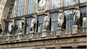 Devant les verrières sont disposées quatorze statues de villes françaises. De gauche à droite: Boulogne et Compiègne, par Pierre Cavelier (1814-1894), Saint-Quentin et Cambrai, par Auguste Ottin (1811-1890), Beauvais et Lille, par Charles Lebœuf-Nanteuil (1792-1865), Amiens et Rouen, par Eugène Lequesne (1848-1939), Arras et Laon, par Théodore Gruyère (1813-1885), Calais et Valenciennes, par Henri Lemaire (1798-1880), Douai et Dunkerque, par Gustave Crauk.(1827-1905)