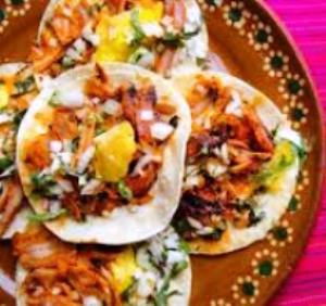 Les ingrédients nécessaires pour réaliser les tacos al pastor sont : viande de porc coupée en lanières, huile d’olive, oignons, ananas coupé en morceaux, tortillas, oignons marinés, coriandre fraîche,