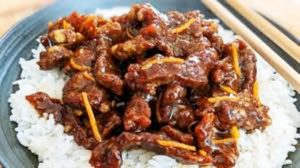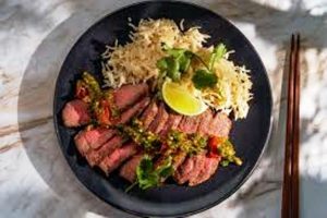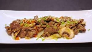 Ce plat est d’inspiration Thaï. L’onglet de boeuf est émincé et sauté avec de l’oignon, de l’ail, des tomates et des raisins secs. Il est épicé avec de la cannelle, de la noix de muscade et de la coriandre fraîche. Pour l’accompagner, une bonne salade verte !
