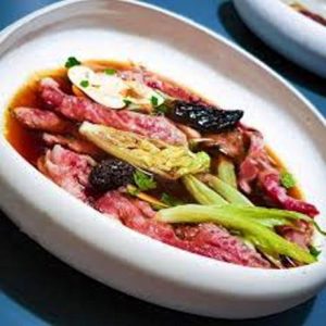 Pour les adeptes du terre-mer, une recette originale qui mêle du bœuf rôti à l’huître légèrement snackée avec du beurre de soja et légumes au dashi.