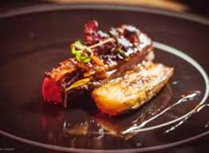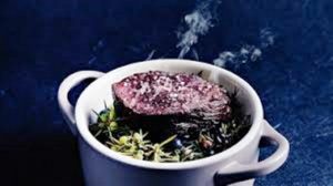 L’onglet de bœuf fumé au bois de genièvre de Jean Sulpice, chef doublement étoilé de l’Auberge du Père Bise à Talloires (Haute-Savoie).