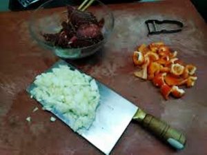 Les ingrédients utilisés pour réaliser cette recette sont : onglet de bœuf, oignon, poivron rouge, huile, sel, poivre, sauce soja, vinaigre balsamique, vin blanc…