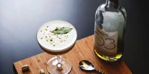 Ingrédients : Pastis, liqueur St Germain, jus de citron, blanc d’œuf, romarin, sucre brun.